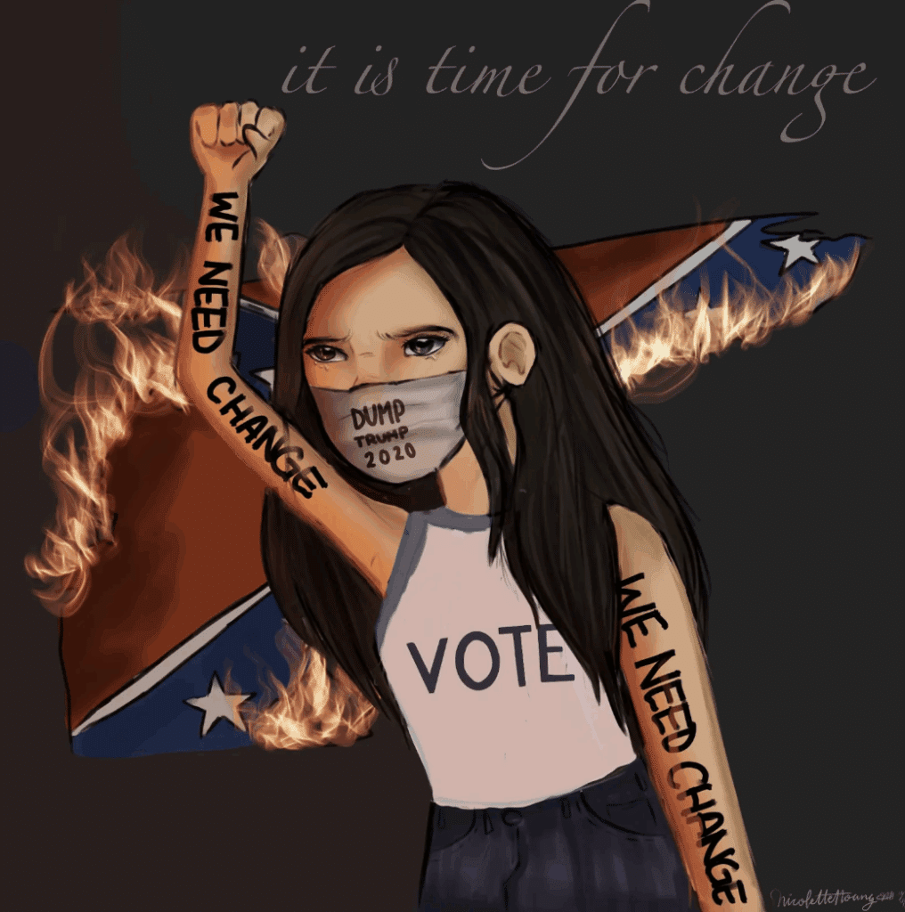 At the end of Trump’s first term in 2020, I illustrated the piece “It is Time for Change” for the ACLU’s Art Justice Squad digital journal called the Road to Find. It depicts me, mask and all, protesting with a burning Confederate flag behind me. Then and now, I saw Trump’s presidency as a return to the times of a Confederate-like, racist, and evil society. I wanted my art to convey the necessity to vote for peace, equality, and democracy. I felt Trump’s presidency was opposite those ideals and created a threat to our society and the future of our nation. I was an 8th grader back in 2020, resisting with fellow students, and I continue this work now as a high school senior.